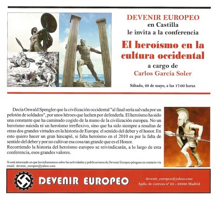 Decía Oswald Spengler que la civilización occidental «al final sería salvada por un pelotón de soldados», por unos héroes que luchen por defenderla. El heroísmo ha sido una constante que ha caminado cogido de la mano de la civilización europea. No un heroísmo suicida ni un heroísmo irreflexivo, sino que ha sido siempre a resultas de otras dos grandes virtudes de la historia de Europa: el sentido del deber y el honor. En esto quiero hacer gran hincapié, si falta heroísmo en el 2010 es por la falta de sentido del deber y por no cultivar esa cosa tan grande que es el Honor.