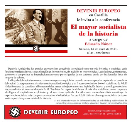 La llegada del capitalismo como sistema rompe este equilibrio, creando una masa popular explotada en beneficio del capital. La respuesta marxista fue una aberración ideológica y un fracaso económico. Sólo el socialismo de Adolf Hitler fue capaz de contribuir al bienestar de las masas trabajadoras con la legislación laboral y unos logros sociales sin precedentes ni antes ni después de él. También fue capaz de elaborar el más alto socialismo como respuesta ideológica al capitalismo explotador y al marxismo apátrida. La Alemania nacionalsocialista constituye la experiencia socialista más completa de nuestro ciclo histórico. Por eso Adolf Hitler es el más grande socialista de todos los tiempos, el mayor socialista de la historia.