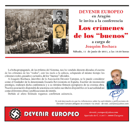 A Joaquim Bochaca, miembro de la asociación Devenir Europeo, se le puede considerar como el fundador de la denominada Escuela Revisionista de España. Escritor de reconocido prestigio, realizará dicha conferencia y a su término firmará ejemplares de su extensa obra. Nuestra asociación dispondrá de una mesa con todos sus títulos disponibles en la actualidad así como diferentes obras y publicaciones de interés.
