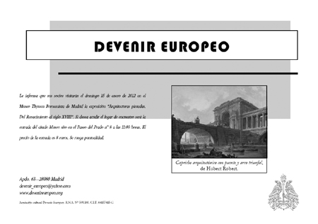 Devenir Europeo le informa que sus socios visitarán el domingo 15 de enero de 2012 en el Museo Thyssen Bornemisza de Madrid la exposición «Arquitecturas pintadas. Del Renacimiento al siglo XVIII». Si desea acudir el lugar de encuentro será la entrada del citado museo sito en el Paseo del Prado nº8 a las 11:00 horas. El precio de la entrada es 8 euros. Se ruega puntualidad.