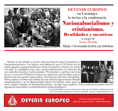Mucho se ha hablado y escrito sobre la relación entre cristianismo y nacionalsocialismo. Los tópicos nos hablan de que el III Reich era un estado pagano y pangermanista que atacó a la Iglesia cristiana y la redujo a la nada. La realidad es muy otra, encontrando pruebas y evidencias de una estrecha relación y lucha conjunta. Protestantes y católicos tuvieron su voz y voto en el III Reich, limaron sus asperezas, que las hubo, pero el balance fue muy positivo para ambos. Testimonios, decretos, fotografías, libros, diarios y folletos nos hablan de esta relación que se ha desvirtuado completamente y se ha distorsionado hasta convertirla, como pasó en otros campos tocantes al nacionalsocialismo, en algo muy negativo. Esta conferencia puede resolver algunas de estas dudas y aclarar bastantes temas al respecto.