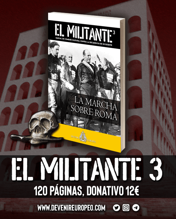 Como nacionalsocialistas, albergamos ciertas diferencias de cosmovisión con el Fascismo Italiano, pero no es el momento de ahondar en ello. Aquí y ahora, nos inclinamos en humilde señal de admiración y gratitud ante la obra del hombre cuyas excepcionales cualidades sirvieron de referencia a los revolucionarios de todo el mundo y lograron abrir la puertas de una nueva era que, en justo reconocimiento, lucirá por siempre el nombre genérico de FASCISTA. Una era que irradió sus primeras luces en la Marcha hacia Roma y que culminará en un grandioso amanecer cuando todos los pueblos libres —en palabras de nuestro camarada Ramón Bau— marchen imparables sobre las ruinas de Wall Street.