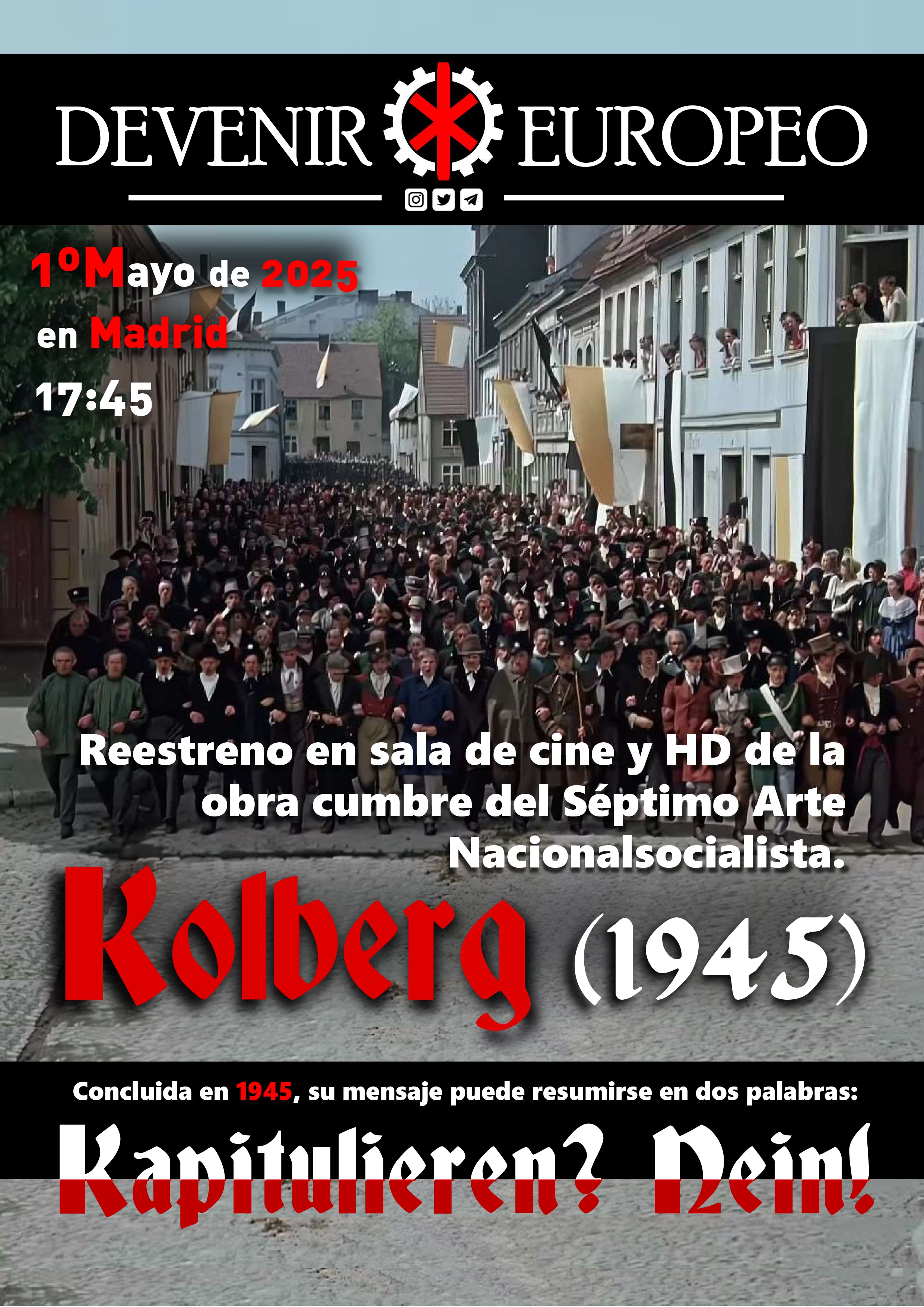 Reestreno en sala de cine, a color y HD de la obra cumbre del Séptimo Arte Nacionalsocialista. Acompañada de una nueva traducción al castellano que solventa las numerosas deficiencias y omisiones de las versiones anteriores. Kolberg reúne y lleva a su máxima expresión todos los valores éticos, estéticos e ideológicos del cine del III Reich.