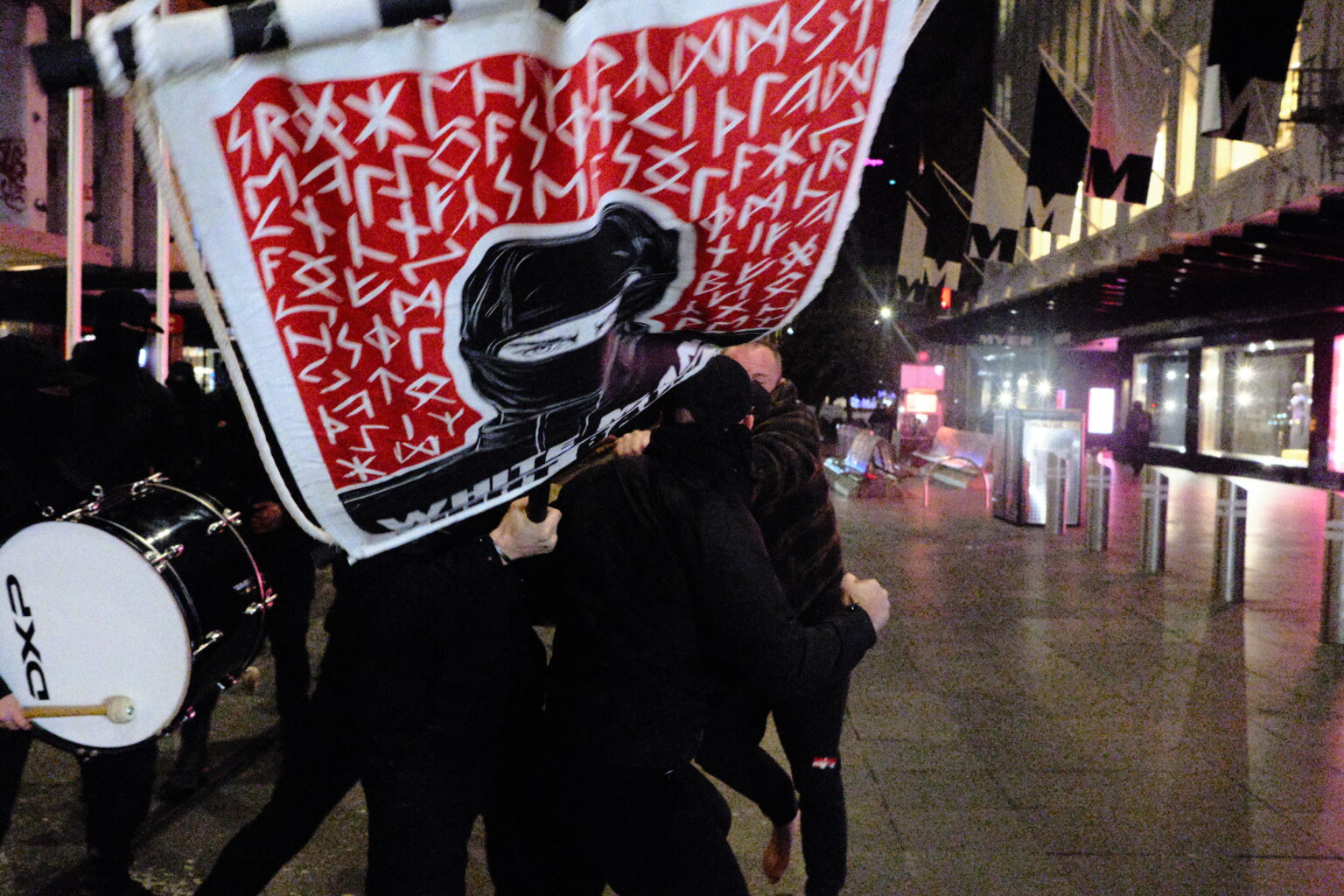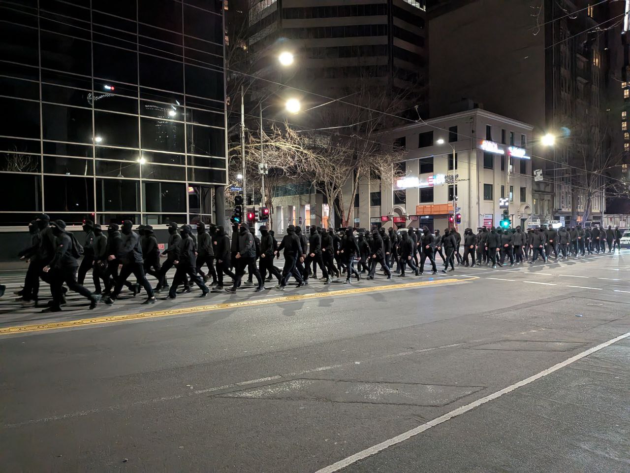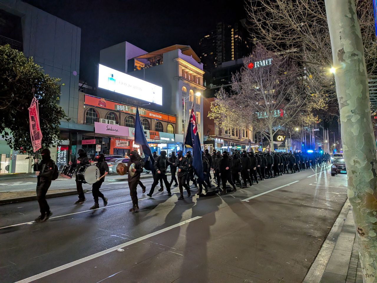 Unos 150 miembros de la Red Nacional Socialista –la rama activista de la organización política Australia Blanca– desfiló por las calles de Melbourne (Australia), poco antes de la 1 de la madrugada, acompañados por una pequeña orquesta marcial.