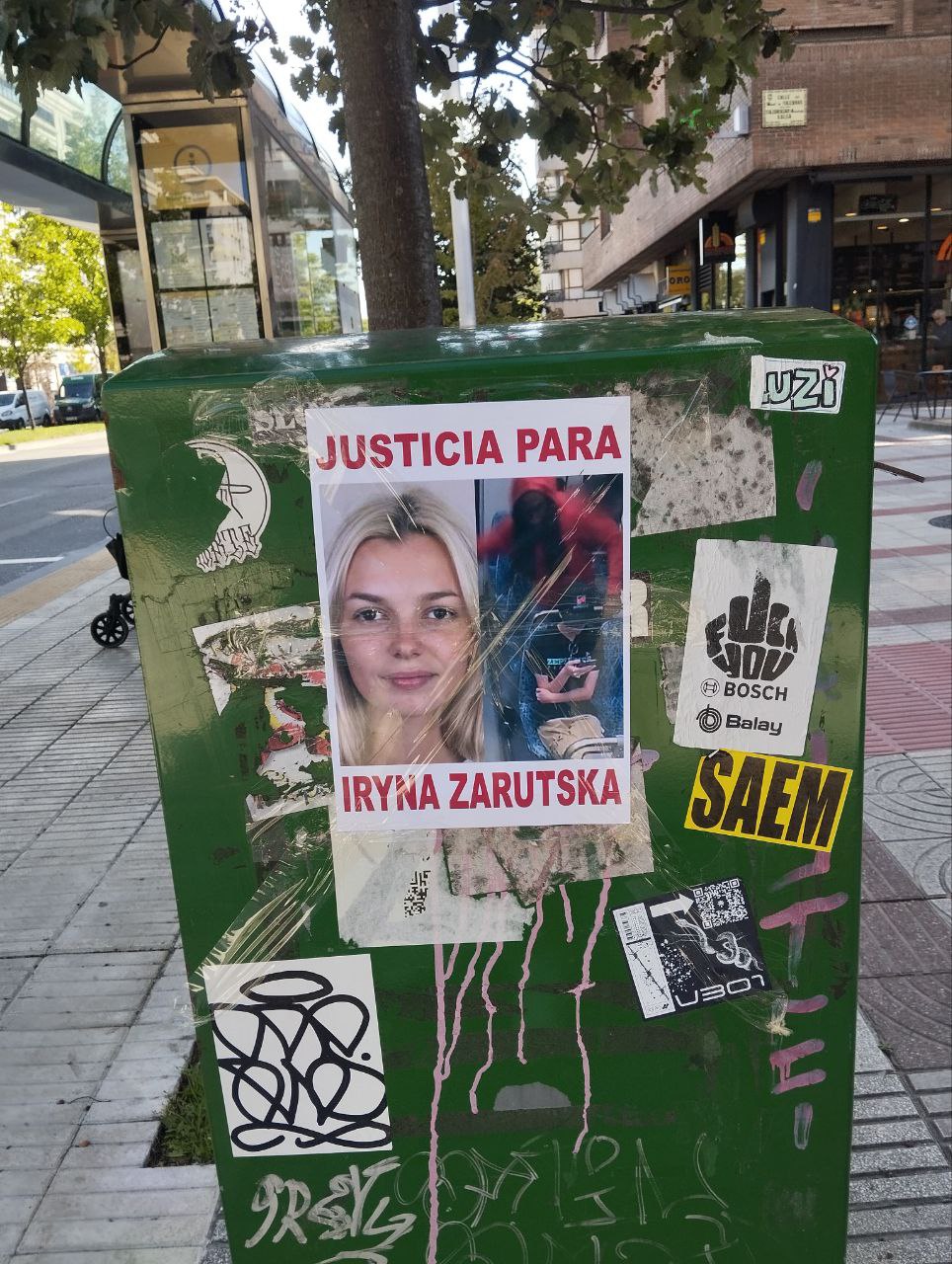 Activistas de la asociación han distribuido carteles en Iruña/Pamplona, Nafarroa, reclamando justicia para la joven ucraniana Iryna Zarutska.