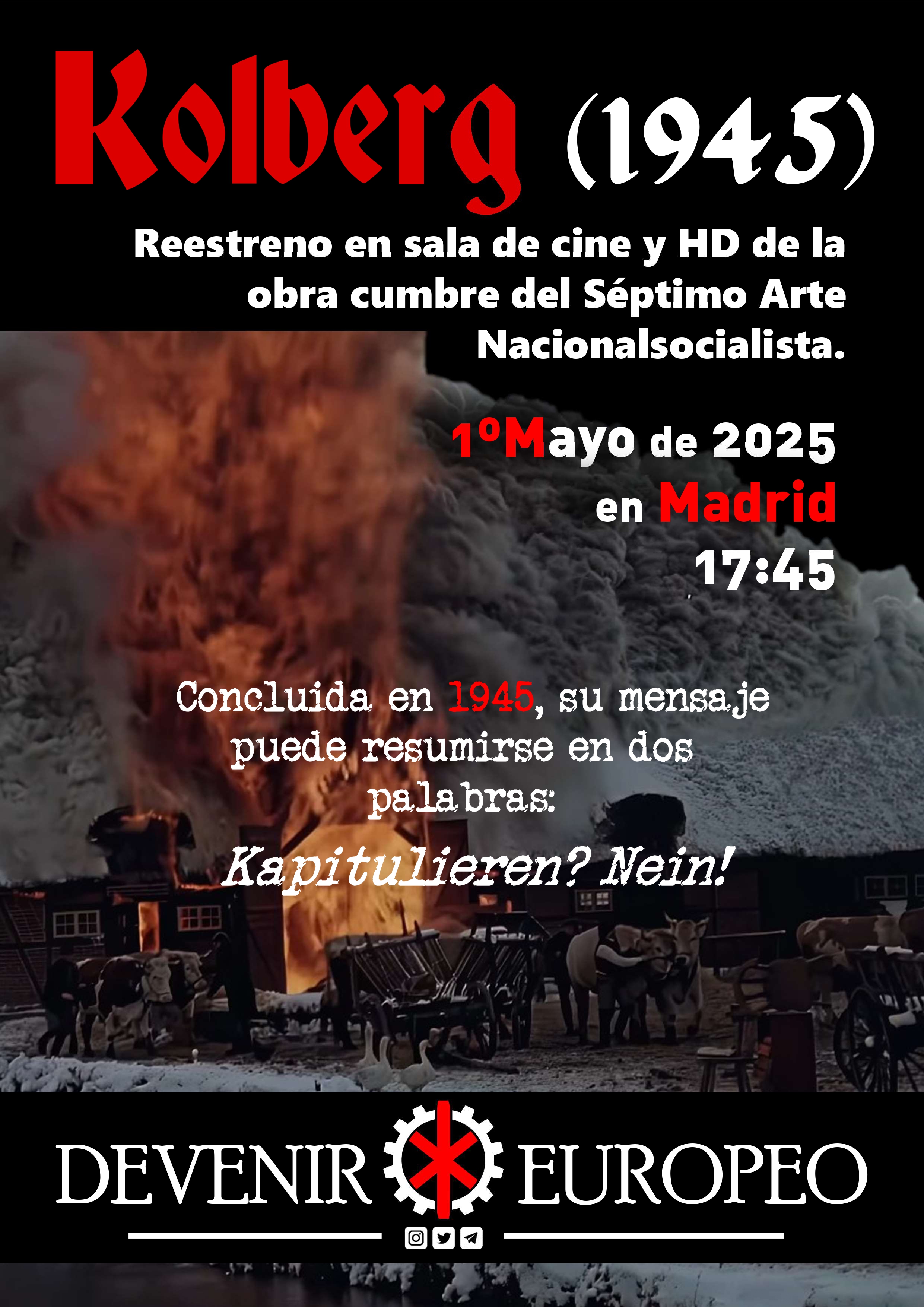 El año pasado presentamos en sala de cine una versión restaurada de la película Hans Westmar, recreación libre de la vida y martirio del joven SA Horst Wessel, cinta que nos traslada a los años finales de la lucha por el poder del NSDAP. Este año hacemos lo propio con una versión en 4K de la obra cumbre del Séptimo Arte Nacionalsocialista: Kolberg. Acompañada de una nueva traducción al castellano, a cargo de uno de nuestros militantes, que solventa las numerosas deficiencias y omisiones de las versiones anteriores.