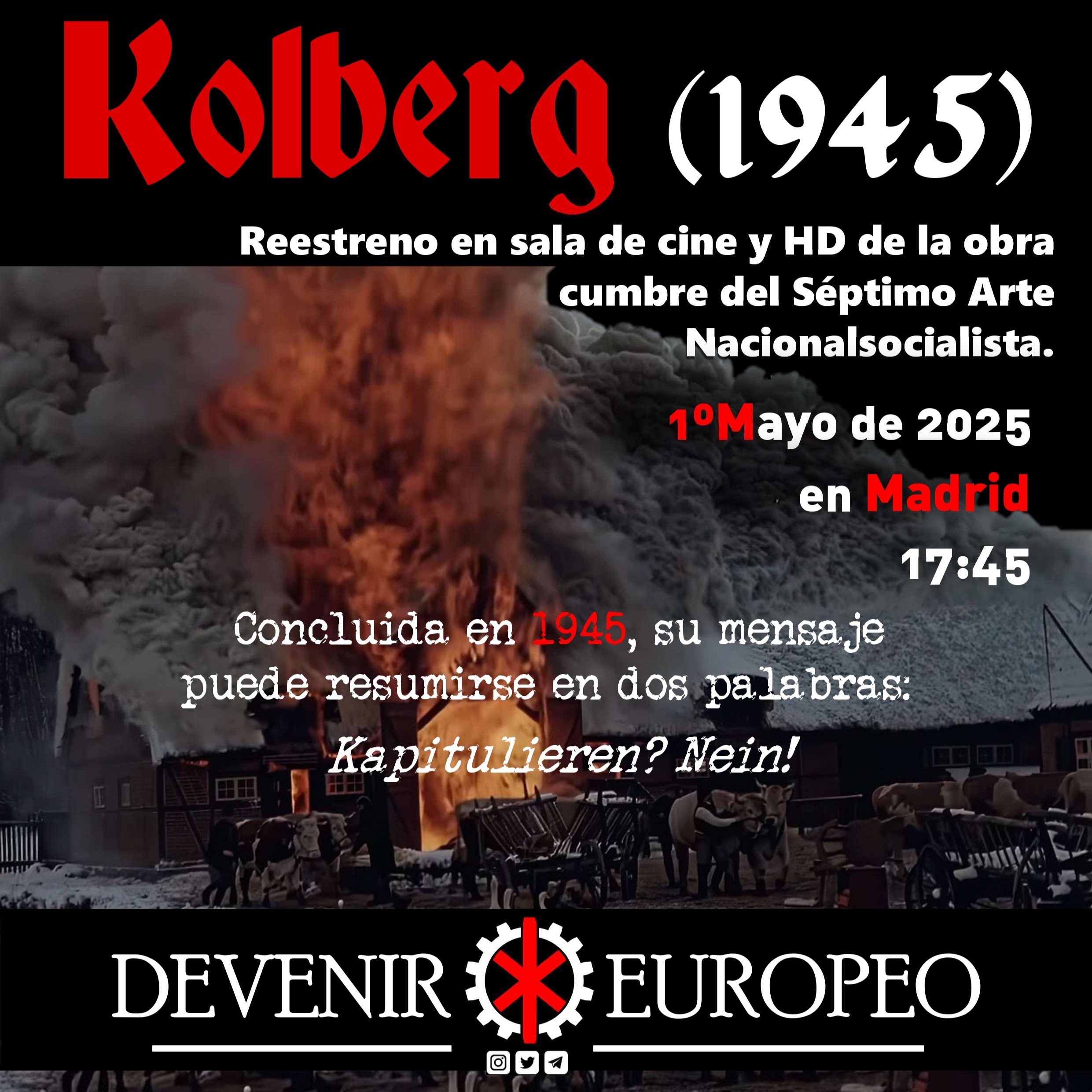 Reestreno en sala de cine, a color y HD de la obra cumbre del Séptimo Arte Nacionalsocialista. Acompañada de una nueva traducción al castellano que solventa las numerosas deficiencias y omisiones de las versiones anteriores. Kolberg reúne y lleva a su máxima expresión todos los valores éticos, estéticos e ideológicos del cine del III Reich.